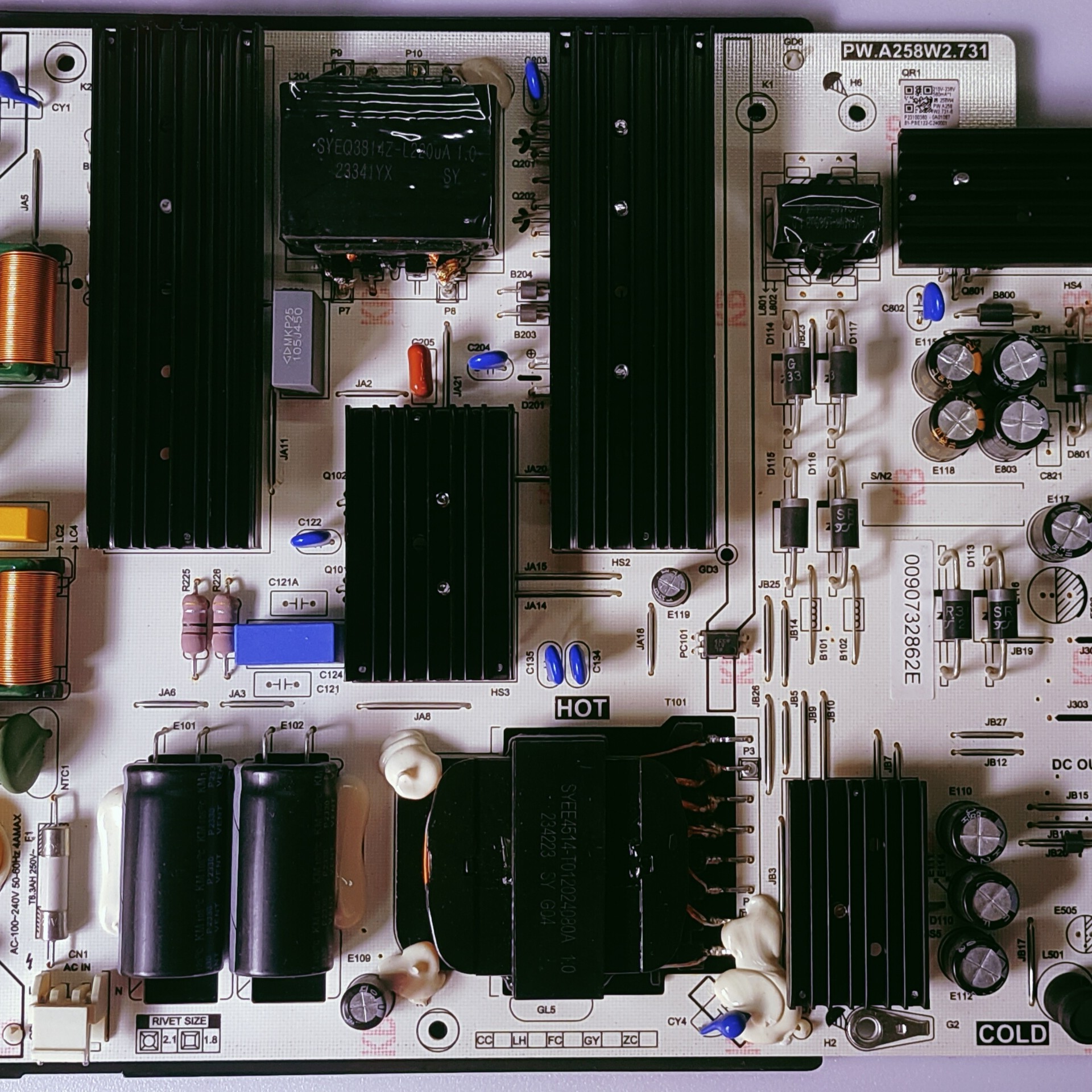 Function: Converts main AC power to various DC voltages for the TV's main board, display, and audio systems.