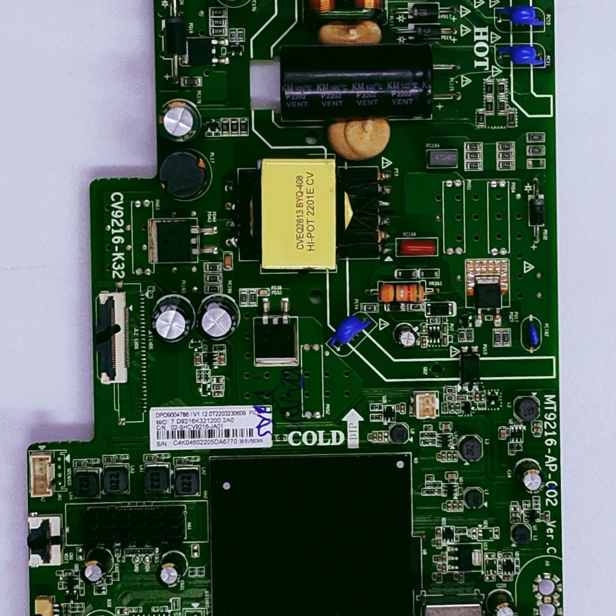 The identified part is a OnePlus LED TV motherboard, compatible with model 32HD2A00 and featuring board number CV9216-K32. This is a smart TV main board designed for 32-inch HD Ready TVs.
