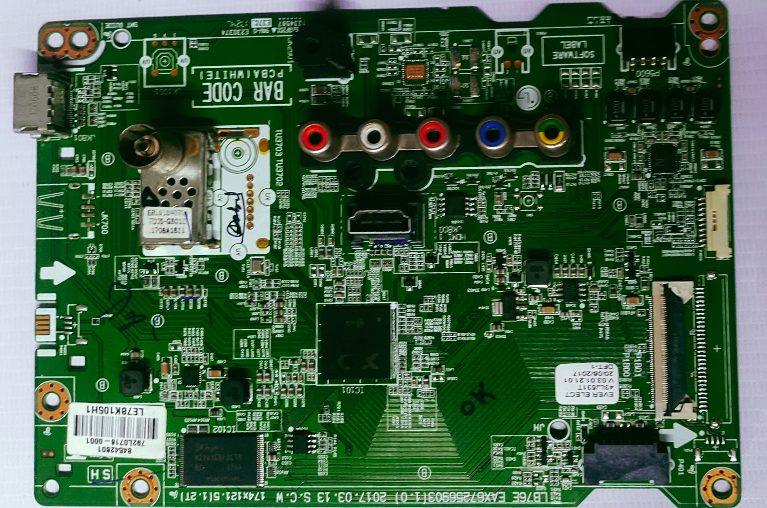 LG LED ANDROID MOTHER BOARD MODEL NUMBER 43LJ531T The image displays the main board for an LG 43LJ531T LED TV. Main Board Details: Model Number: 43LJ531T. Part Number (Partial): EAX67256903(1.0). Date of Manufacture/Revision: 2017.03.13 (March 13, 2017). Manufacturer/Supplier Information: "EVER ELECT" is visible on the board, along with a date "20/06/2017" and "DFT-1". Connectors and Components: The board features various connectors for inputs (e.g., HDMI, AV) and outputs, as well as integrated circuits (e.g., IC101, IC102) and other electronic components typical of a television main board. Bar Code Area: A "BAR CODE PCBAI(WHITE)" area is designated on the board. Specific ICs: Includes components like TU3703 TU3702, likely related to tuner functionality. Software Label Area: A "SOFTWARE LABEL" area is also indicated on the board.