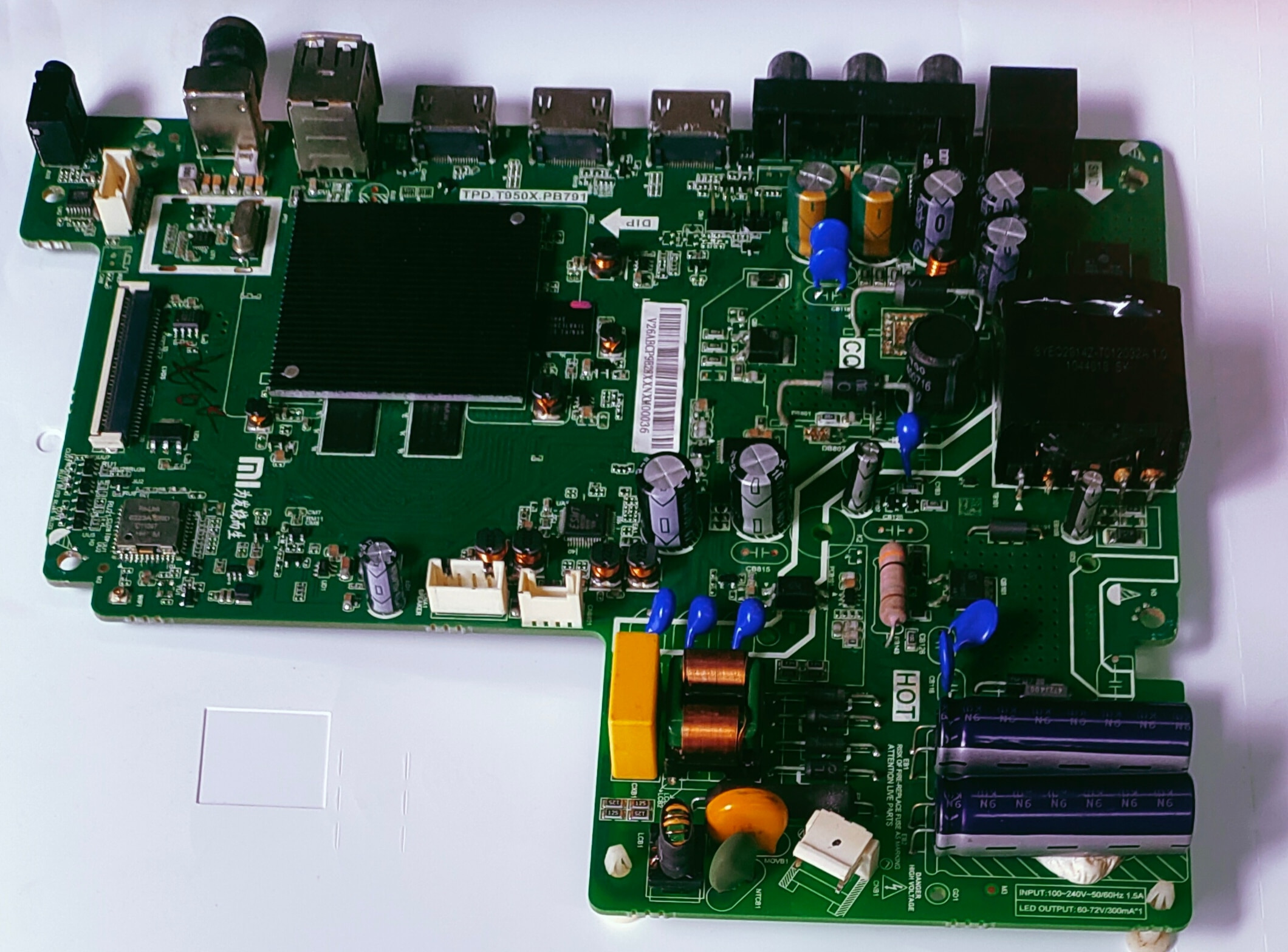 MI 4K ANDROID MOTHER BOARD MODEL NUMBER L32M5-AL The MI L32M5-AL TV uses a mainboard model TPD.T950X.PB791. This board is compatible with the 32-inch MI LED TV and supports Android OS. It features 3 HDMI ports, 2 USB ports, built-in Wi-Fi (802.11a/b/g/n 2.4 GHz), and an Ethernet (RJ45) port. The board is designed for HD panels with a resolution of 1366x768. It's also described as having double the RAM for enhanced performance. Here's a more detailed breakdown: Compatibility: Specifically designed for the MI L32M5-AL (32-inch) LED TV model. Mainboard Model: TPD.T950X.PB791. Operating System: Runs on Android (version may vary). Connectivity: 3 HDMI ports. 2 USB ports. Built-in Wi-Fi (2.4 GHz). 1 Ethernet (RJ45) port. Display: Supports HD panels with a resolution of 1366x768. RAM: Features double the RAM for improved processing and speed. Functionality: Can address issues like stuck on MI logo, no display, freezing, and non-functional ports. Installation: Designed for easy installation with basic tools, but professional installation is recommended