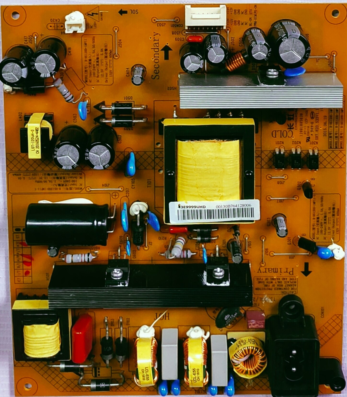 MICROMAX POWER SUPPLY BOARD MODEL NUMBER 43E9999UHD The image displays a power supply board, which is a crucial component in electronic devices like televisions, responsible for converting incoming AC power into various DC voltages required by the device's other circuits. Key details visible on the board: Primary Side: This section, labeled "Primary," handles the high-voltage AC input from the mains power. It includes components like the main input connector, fuses (indicated by "CAUTION FOR CONTINUED PROTECTION AGAINST RISK OF FIRE REPLACE ONLY WITH SAME TYPE AND RATING OF FUSE"), large capacitors, and the primary winding of the main transformer. Secondary Side: Labeled "Secondary," this section deals with the lower DC voltages generated after rectification and regulation from the primary side. It contains components such as output capacitors, diodes, and connectors for delivering power to other parts of the device. Transformers and Inductors: Several yellow-taped transformers and copper-wound inductors are visible, indicating voltage conversion and filtering stages. Capacitors: Various electrolytic and ceramic capacitors are present, used for filtering, smoothing, and energy storage. Heat Sinks: A prominent black heat sink on the primary side and a smaller silver heat sink on the secondary side are present, indicating the presence of power transistors or ICs that dissipate heat during operation. Connectors and Mountings: The board features various connectors for input power and output to other boards, as well as mounting holes for securing it within a device. Labels and Markings: The board includes numerous labels for components (e.g., C301, R210, D501), test points, and safety warnings, aiding in identification and troubleshooting.