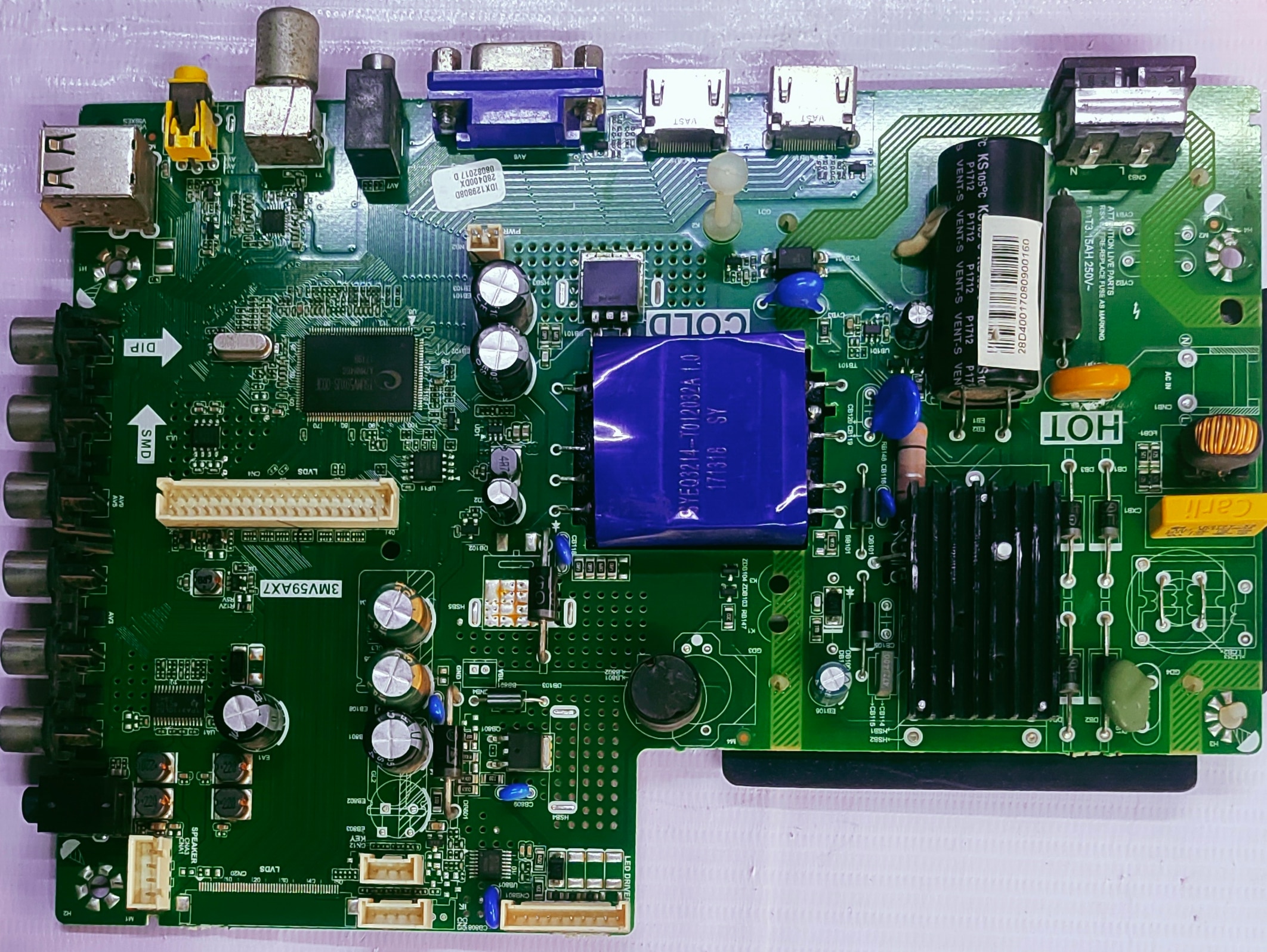 Panasonic Led TV MOTHER BOARD MODEL number TH-28D400DX The image displays the motherboard of a Panasonic TH-28D400DX LED TV. Panasonic TH-28D400DX (28-inch) HD Ready LED TV Details: Model: VIERA TH-28D400DX. Display: 28-inch HD Ready LED screen with a resolution of 1366 x 768 pixels and a 16:9 aspect ratio. Connectivity: Includes USB and HDMI ports. Audio: Features 10W total speaker output (5W per speaker) and auto volume leveller. Power: Operates on 110-240V, with a power consumption of 35W (0.5W in stand-by). Physical Design: Weighs 4 kg with the stand and has dimensions of 650.5 (W) x 405.9 (H) x 73.8 (D) mm. Smart Features: This model is not a Smart TV but includes Hotel Mode.