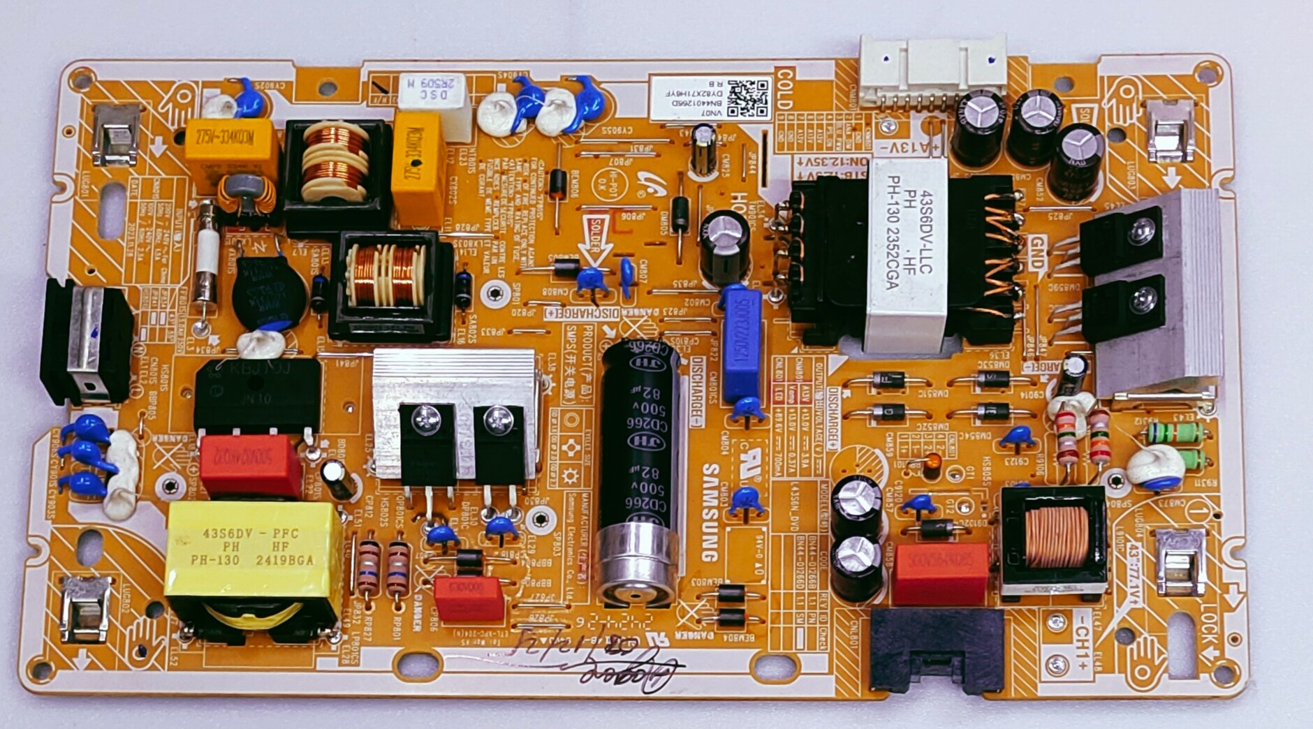 SAMSUNG LED TV POWER SUPPLY BOARD MODEL NUMBER UA50DUE70BKLXL The Samsung TV model number UA50DUE70BKLXL uses a specific power supply board that can typically be identified by a BN44-xxxxxxA/B part number printed on the board itself. This board converts the AC power into the various regulated DC voltages needed for the TV's internal components, such as the main board and LED backlights. Key Details Function: The power supply unit (PSU), or Switched-Mode Power Supply (SMPS), is responsible for managing and distributing power throughout the TV. Identification: The exact part number (e.g., BN44-00807A, BN44-00932A) is crucial for finding a correct replacement. The generic model number alone is often insufficient for purchasing the correct component. You will need to open the back of the TV to check the number printed on a white sticker or directly on the board. Common Symptoms of a Faulty Board: TV does not turn on (no power). The standby light is lit, but the TV will not power on. Clicking sounds from the TV when trying to power it on. Backlight issues or the TV suddenly shutting down.