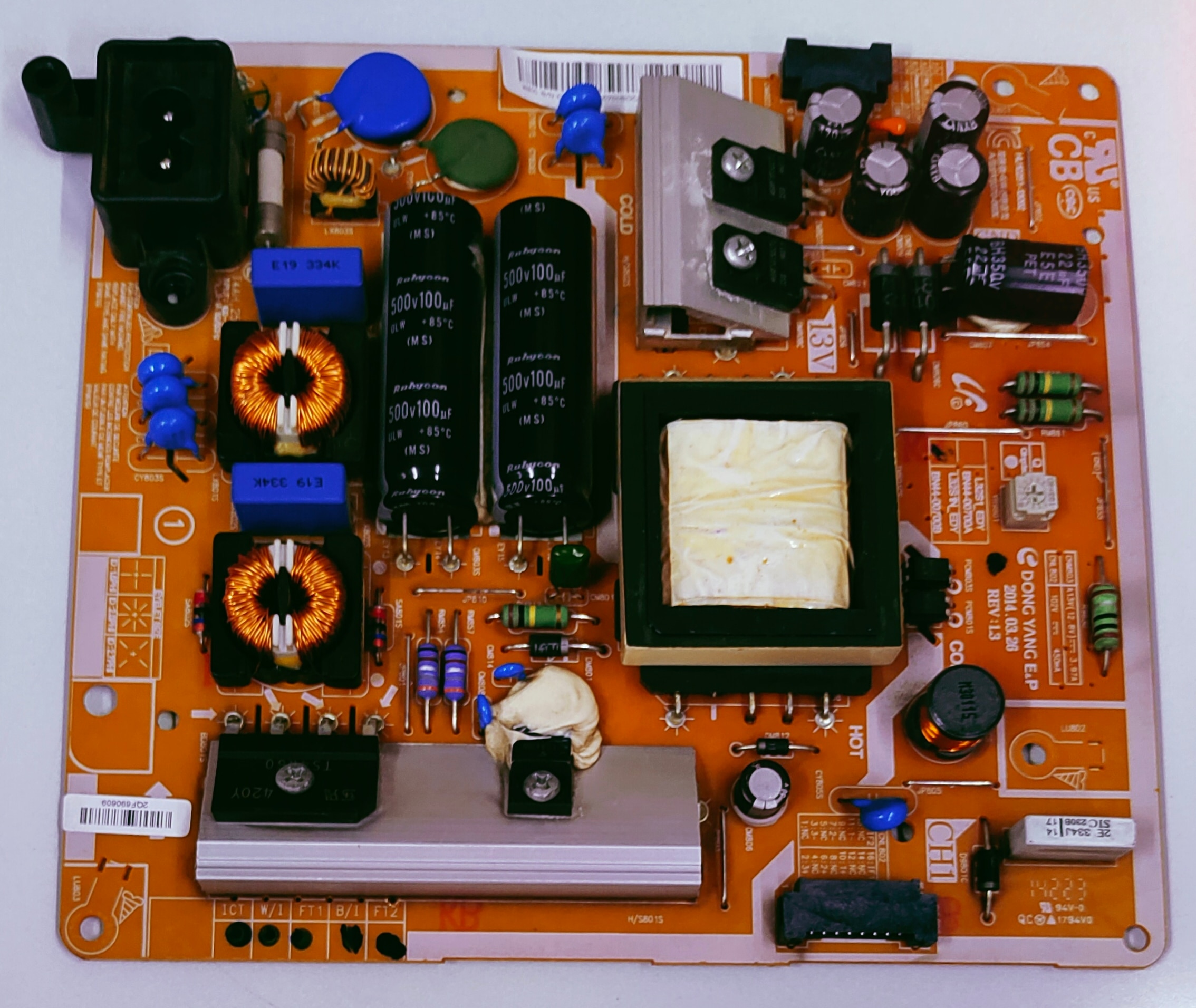 SAMSUNG POWER SUPPLY BOARD MODEL NUMBER UA32H5570AV The image displays a Switched-Mode Power Supply (SMPS) board, specifically identified as the power supply board for the Samsung UA32H5570AV LED TV model. Key Details of the UA32H5570AV SMPS Board: Function: This board is responsible for converting the incoming AC power to the various DC voltages required by the different components of the TV, including the main board, LED backlight, and other modules. It is crucial for the TV's overall operation and power management. Compatibility: This SMPS board is designed to be compatible with the Samsung UA32H5570AV LED TV model. It is essential to ensure exact model compatibility when replacing such a component. Common Issues Addressed: Replacing this SMPS board can resolve various power-related issues in the TV, such as no power, clicking relays, or backlight problems. Components: The board features various electronic components, including capacitors (like the Rubycon 500V 100µF capacitors visible in the image), inductors, transformers, and integrated circuits, all working together to regulate and supply power. Originality and Testing: When purchasing a replacement, it is recommended to opt for original, tested boards to ensure compatibility and performance.