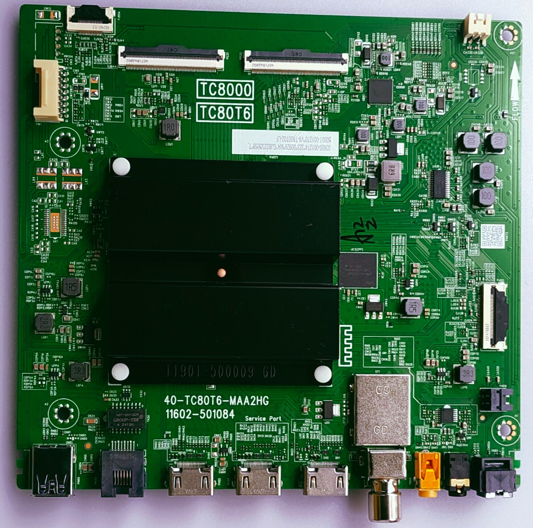 TCL 4K ANDROID MOTHER BOARD BOARD DETAILS TC8000-TC80T6 -TC80T6-MAA2HG 11602-501084 The image displays a TCL TV mainboard, specifically identified by the model number "40-TC80T6-MAA2HG" and "11602-501084" printed on it. Here's some information about this type of component: Function: The mainboard is the central control unit of a TCL LED TV, responsible for processing video and audio signals, managing the operating system, and controlling various functions like power management and communication with other devices. Compatibility: This particular mainboard is designed for TCL LED TVs and is compatible with certain models, as indicated by the model number. Components: It houses various electronic components, including connectors for display panels, power input, and various ports like HDMI and USB, along with integrated circuits for processing. Repair and Replacement: Mainboards can be replaced if faulty, and kits are available for specific TV models.