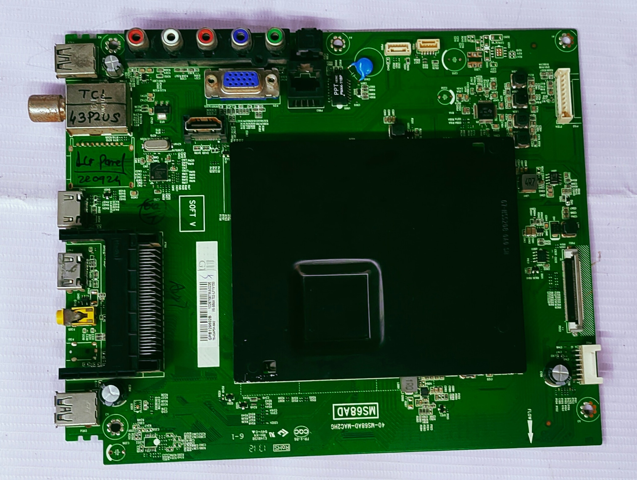 TCL/IFFALCON Android boards model number 43P2U5 The image displays a main board, also known as a motherboard, for a TCL 43P2US television, as indicated by the text "TCL 43P2US" visible on the board itself. Key features and functions of this type of board include: Central Control: It acts as the "brains" of the TV, controlling all essential functions, including audio and video processing. Connectivity: The board features various ports for external connections, such as AV inputs, a VGA port, and an HDMI port. Replacement Part: This specific board is a replacement part for the TCL 43P2US model, used to restore functionality if the original board malfunctions. Importance of Compatibility: When replacing a TV's main board, ensuring compatibility with the specific TV model and serial number is crucial for proper operation.