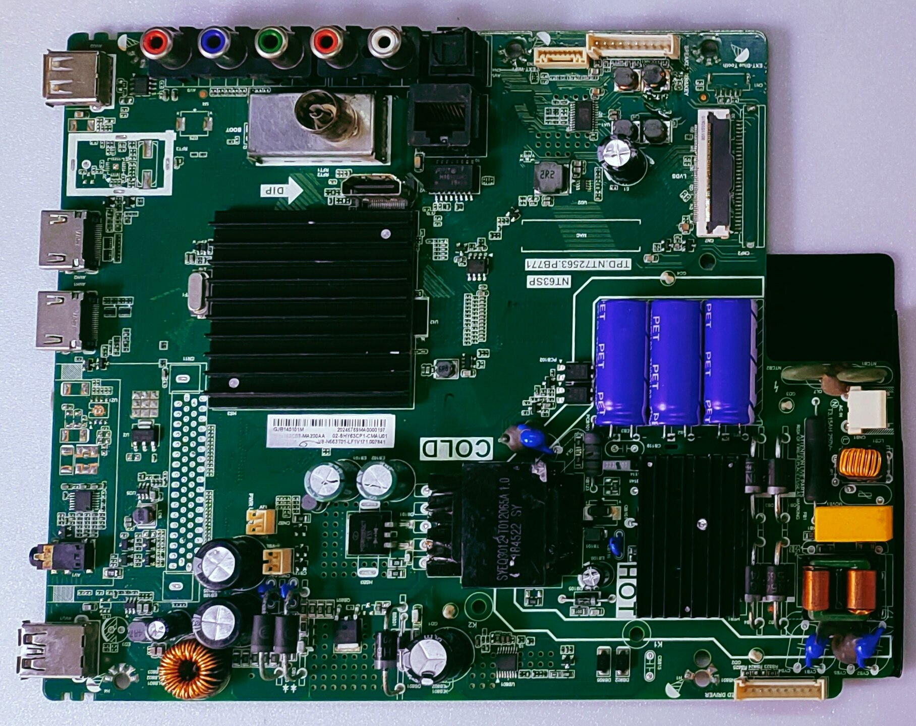 TCL LED TV MOTHER BOARD MODEL NUMBER 43 INCH BOARD BOARD NUMBER NT63SP TPD.NT72563.PB771 The circuit board shown in the image is a TV main board, identified by the model number TPD.NT72563.PB771 and the designation NT63SP printed on it. Board Details Type: This is a main logic board (motherboard) used in various television models, primarily from manufacturers like TCL and Semp. Model Number: TPD.NT72563.PB771. Compatibility: This specific board model is compatible with several TV models, including some variations of the TCL L32S4900S, L40S4900FS, and L43S4900FS series. Features: The board includes various ports such as HDMI, USB, and audio/video inputs. It also features a heatsink for the main processor and designated "HOT" and "COLD" areas for temperature management. Function: It is the central component responsible for processing video and audio signals, managing inputs, and controlling other TV functions.