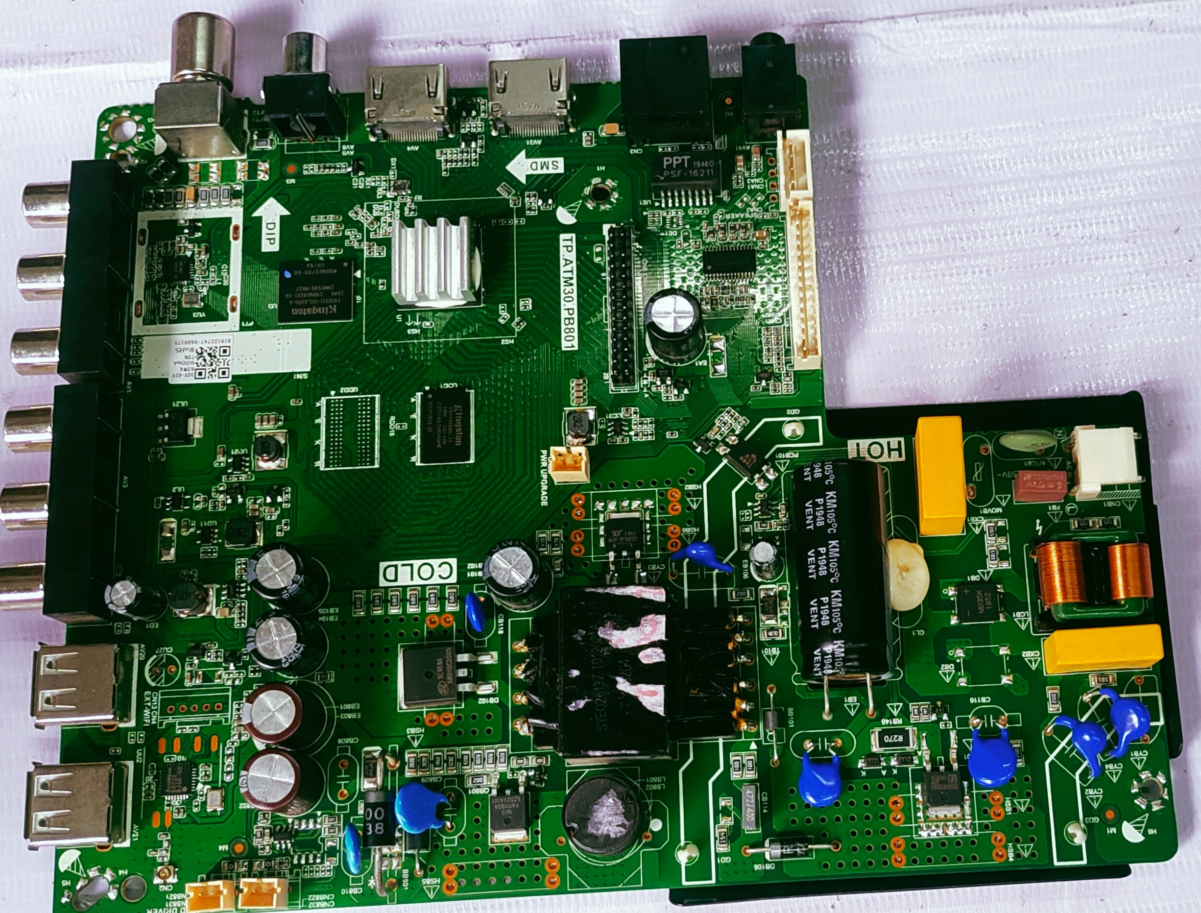 The image displays a television mainboard, specifically identified by the part number TP.ATM30.PB801. This board is designed for use in 40-inch LED TVs. It is a crucial component, often referred to as the motherboard, responsible for managing the TV's functions, including audio and video inputs/outputs. Similar mainboards support features like USB multimedia playback and U disk updating. The board in the image appears to be a used or pre-owned component, as indicated by similar listings for such parts. micromax motherboard
