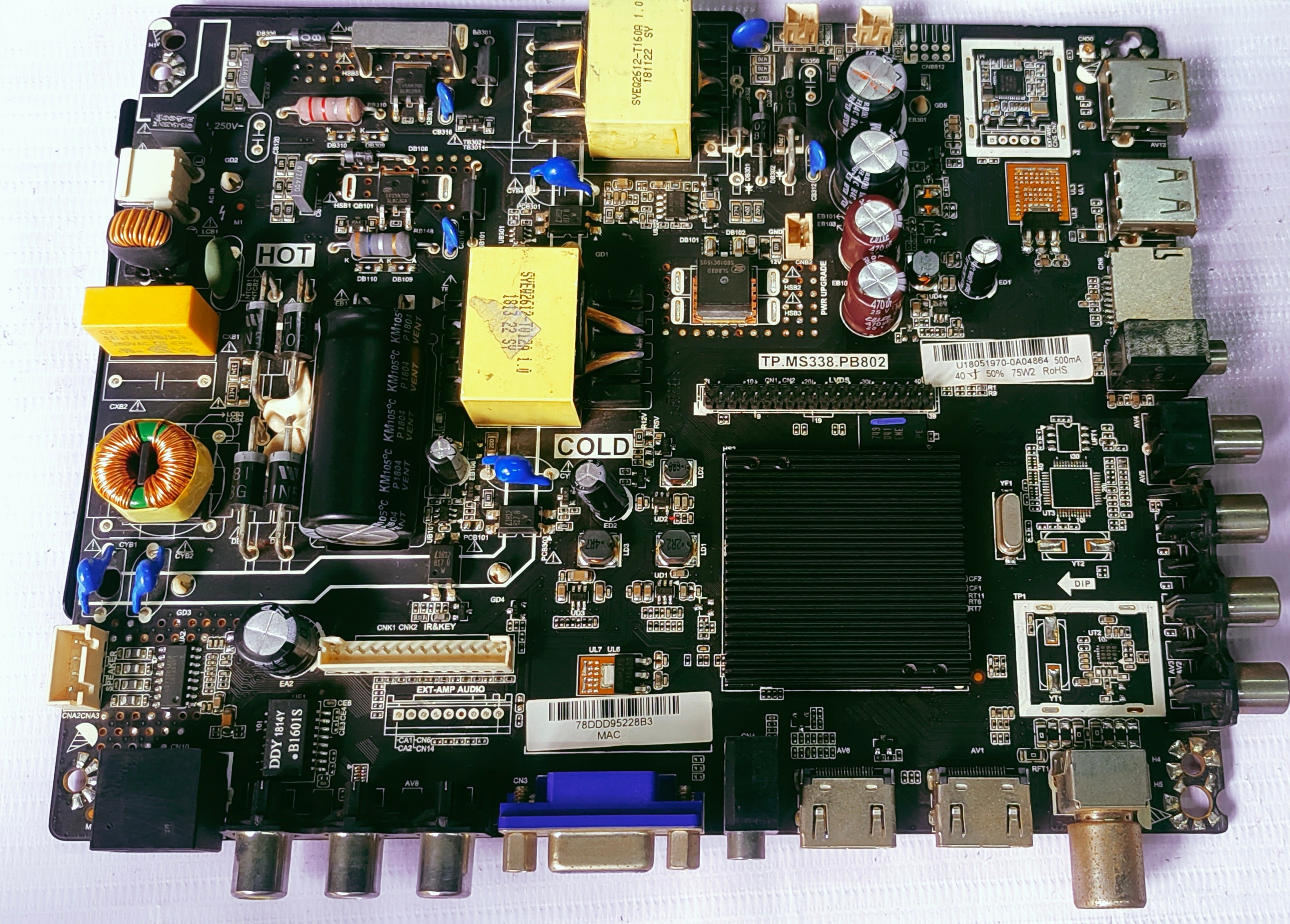 The image displays a TP.MS338.PB802 Android Smart TV Motherboard, also referred to as a Logic Board or Mainboard. This particular model, TP.MS338.PB802, is designed for Android intelligent TVs and is often described as a "Trinity Network" board, implying its integration of various functionalities. It is compatible with various screen sizes, including 32, 39, 40, and 43 inches, and supports specific backlight voltage ranges (e.g., 60V-135V). Motherboards like this serve as the central circuit board connecting and allowing communication between all internal components of a TV, such as the processor, memory, and input/output ports (USB, HDMI, RF input).