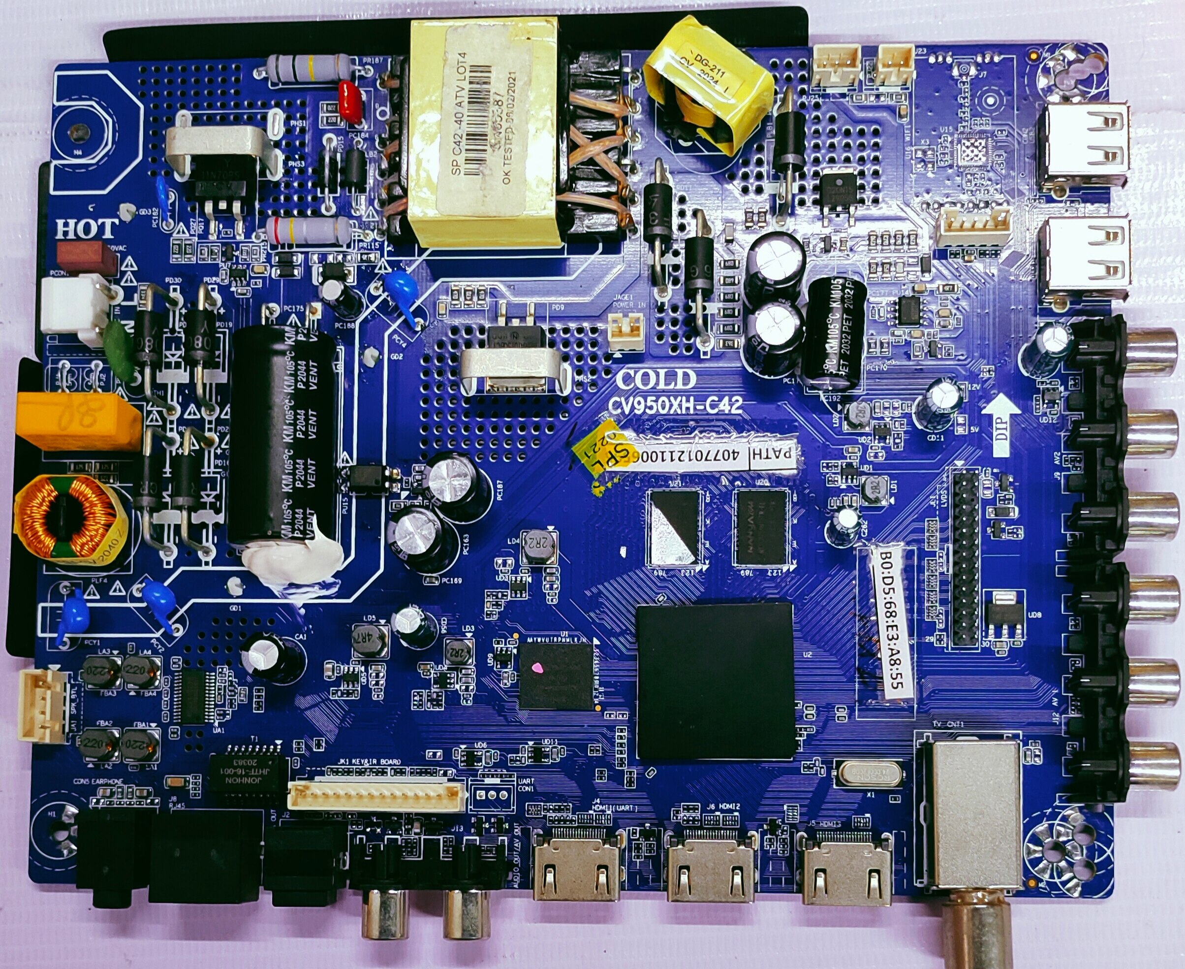 The image displays a Thomson LED TV motherboard, specifically identified by the label "CV950XH-C42" visible on the board itself. This particular motherboard is designed for Thomson LED TVs and is a crucial component for the TV's functionality, including display, sound, and connectivity. It's important to note that specific models of Thomson TVs may require different motherboard versions, so compatibility should always be verified. When replacing or repairing, sourcing original parts is recommended to ensure proper function and maintain the TV's display quality. Professional installation is often recommended to prevent damage during the replacement process.