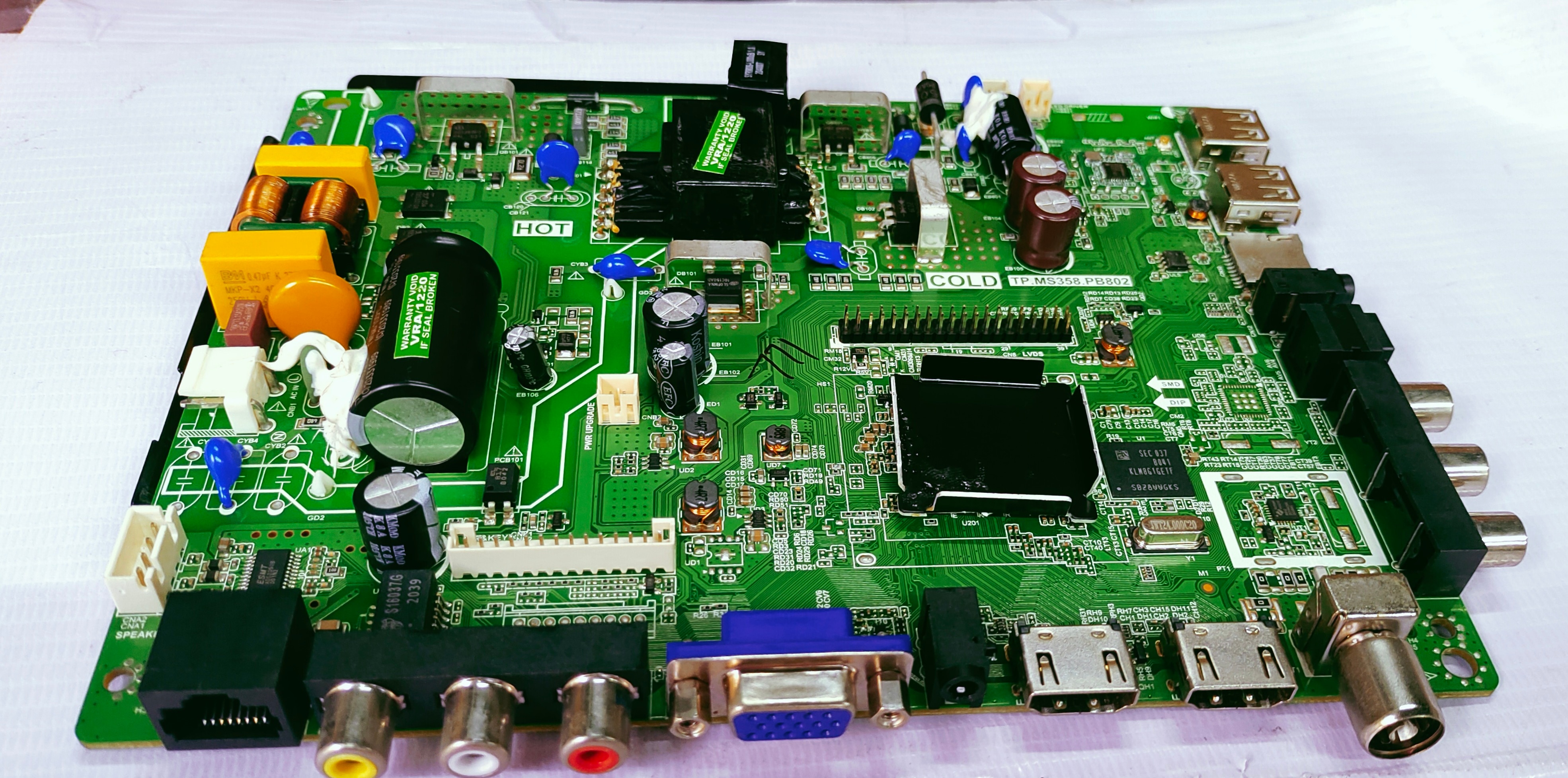 The image displays a Croma LED TV Motherboard, specifically identified as Model CREL7361 with the board number TP.MS358.PB802. This motherboard is designed for Croma LED TVs, particularly compatible with the Croma 43-inch Full HD Smart Android LED TV CREL7361. It serves as the main board, handling audio and video inputs/outputs and acting as the "brains" of the TV. Features of the CREL7361 TV, which this motherboard supports, include Full HD resolution (1920 x 1080 pixels), Wi-Fi connectivity, smart TV capabilities, and 20W in-built box speakers. It supports various OTT video content platforms like YouTube, Amazon Prime Video, Netflix, and more.
