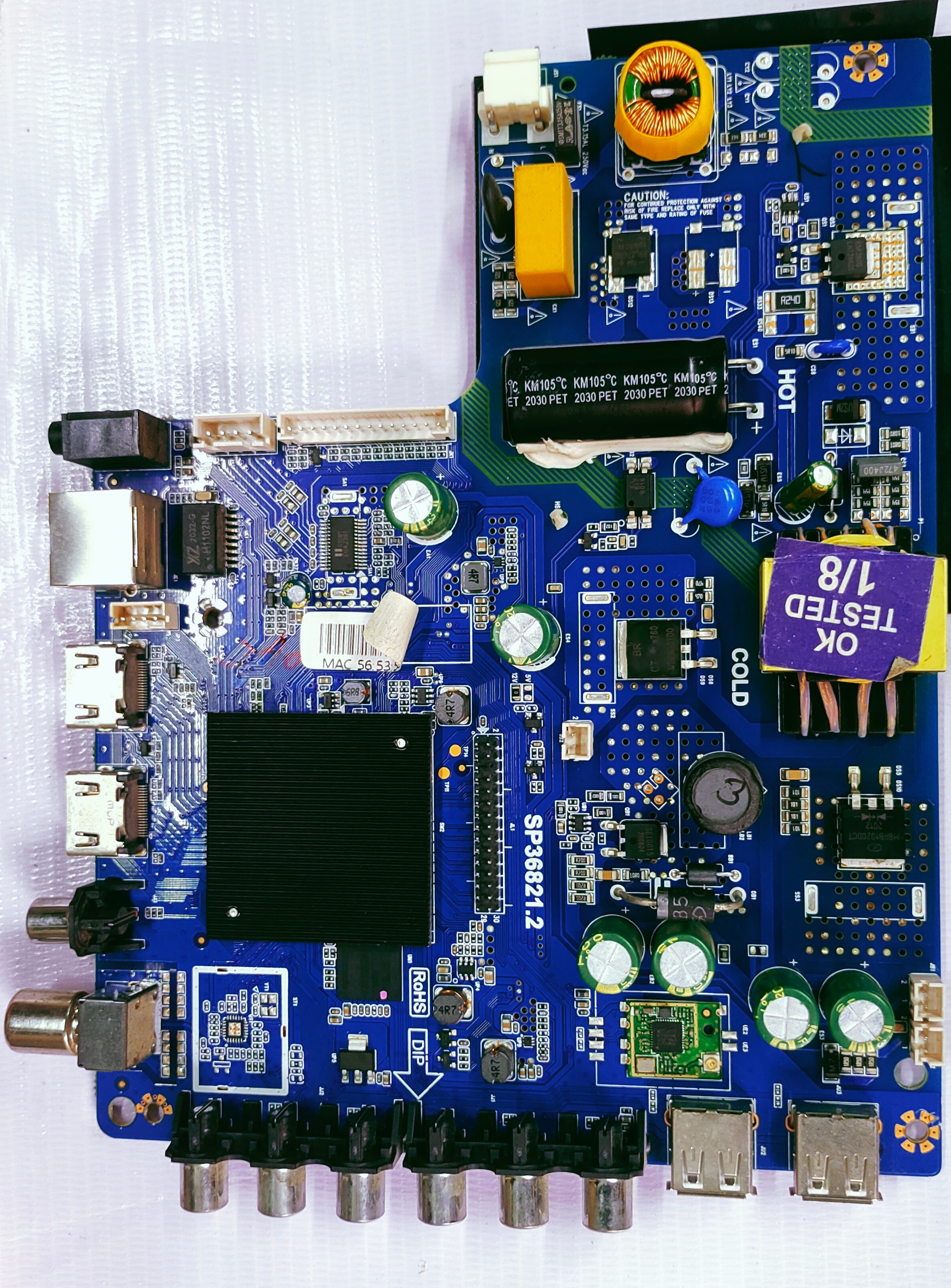 The image displays an SP36821.5 universal smart LED TV Android motherboard. This motherboard is designed to convert a normal LED TV into an Android LED TV. It supports various panel sizes, typically from 14 to 55 inches, with LED backlight support for 32 to 43 inches (64-94V @ 700mA). It offers multiple connectivity options, including AV, dual HDMI, USB, and digital tuner input. Key specifications include HD 1366x768 and FHD 1920x1080 resolution support, 1GB RAM, 8GB ROM, and 5Wx2 sound output. This motherboard can be found on various online marketplaces like Easyspares and Amazon.